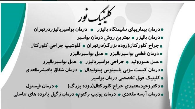 کلینیک نوردرمان بیماریهای نشیمنگاه بالیزردرمان بواسیر با لیزر در تهراندرمان بالیزر-بهترین روش درمان بواسیرجراح کلورکتال(روده بزرگ)درتهرانفلوشیپ جراحی کلورکتالدرمان قطعی بواسیربالیزرعمل بواسیربالیزرعمل هموروئیدجراحی بواسیربالیزرعمل بواسیربالیزردرمان کیست مویی یاسینوس پیلونیدالدرمان شقاق یافیشرمقعدیکلینیک فوق تخصصی درمان بواسیردکتروحیدمعتمدی جراح کلورکتال(روده بزرگ)درمان فیستولدرمان آبسه مقعدیدرمان پولیپ رکتومدرمان زگیل یاتوده های تناسلی